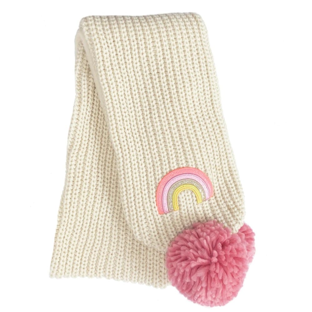 Dieser lustige gestrickte Schal ist mit Fleece gefüttert, mit zwei leuchtenden Bommelbommeln und einem leuchtenden Regenbogendetail an jedem Ende. So irre!