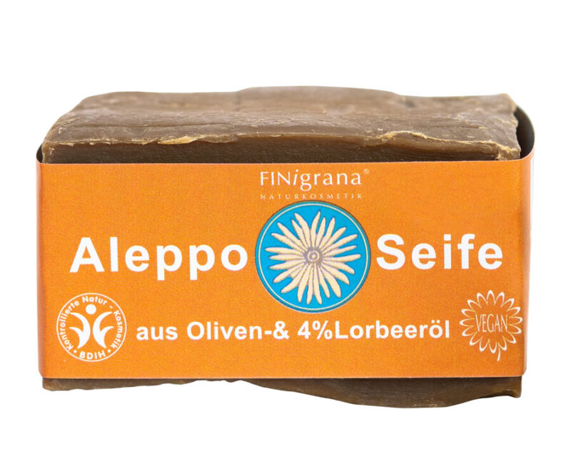 FINigrana Alepposeife, Olive mit 4 % Lorbeeröl wird in traditioneller Seifensiedetechnik hergestellt. Olivenöl wir aus den Früchten des Olivenbaumes, botanisch Olea Europea gewonnen. Der Olivenbaum, stammt ursprünglich aus dem Mittelmeerraum und gehört zu einer der ältesten Kultur und Nutzpflanzen. Sein Holz wächst langsam, ist stark verzweigt, seine Wurzeln sind tiefgreifend und ermöglichen dem Baum an ausreichend Wasser für sein Wachstum zu gelangen. Er verträgt hohe Hitze, aber keinen Frost. Jahrealte Olivenblätter werden unabhängig von der Jahreszeit abgeworfen, denn der Olivenbaum ist eine immergrüne Pflanze. Seine schmalen lanzettenförmigen Blätter sind an der Oberseite ledrig grün und unterseitig silbrig glänzend. An dieser silbrigen Blatt Unterseite befinden sich feine, sternförmige Schuppenhaare, die sogenannten STERNENHAARE, die das Laub vor dem Austrocknen schützen. Aus den Öffnungsspalten austretendes Wasser wird eingefangen und dem Blatt wieder zurück gegeben!