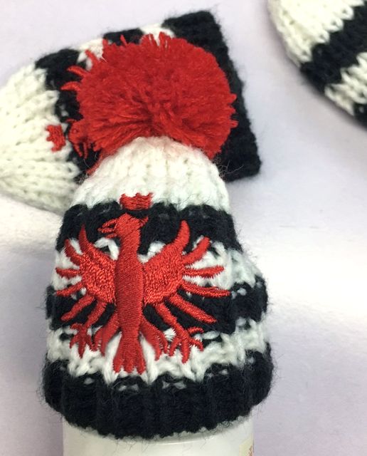Frankfurt Adler Eierwärmer aus reiner Wolle in Schwarz, Weiß, Rot gestrickt natürlich mit dem roten Frankfurt Adler bestickt.