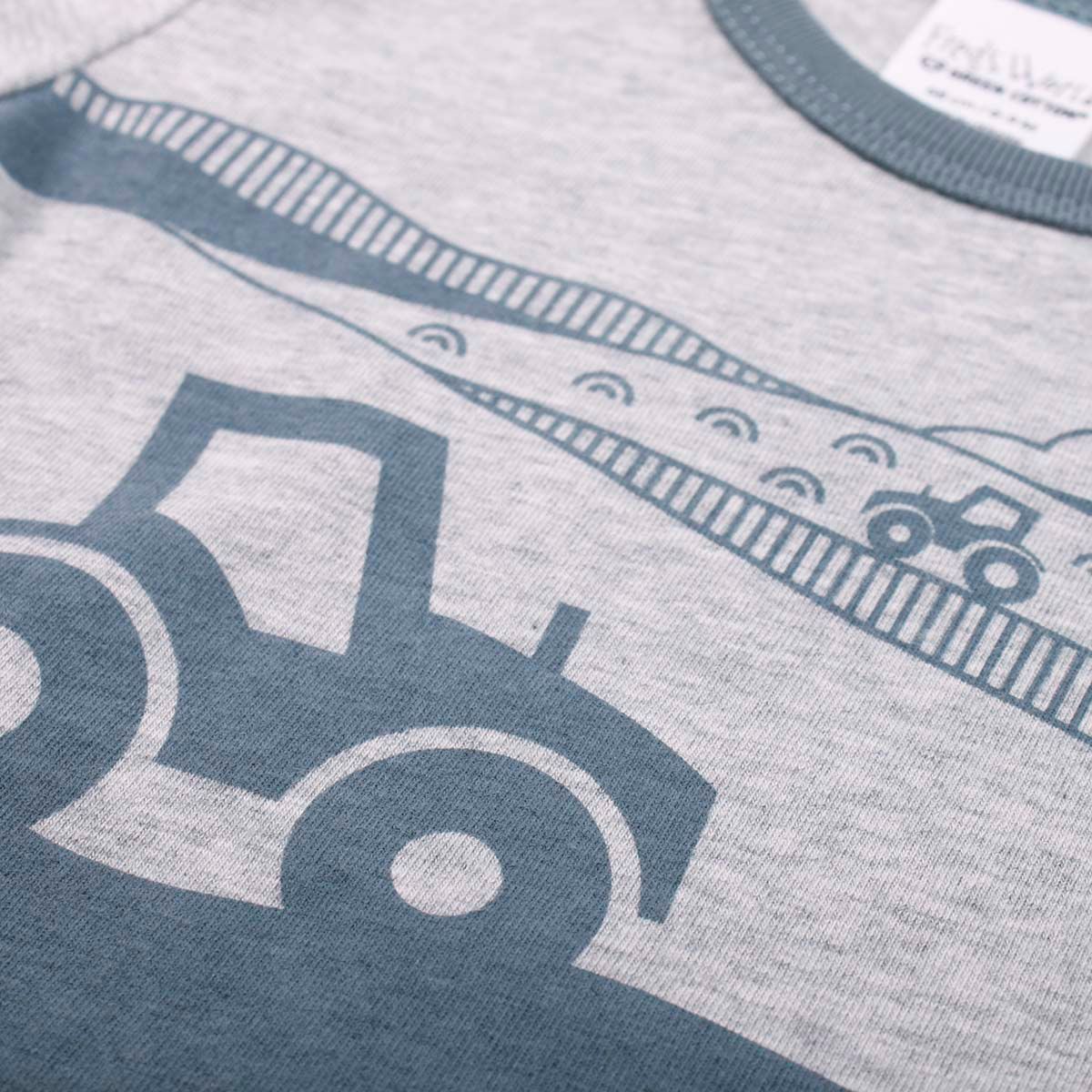 Kurzarmshirt in grau-meliert/rauchblau mit Trecker-Druck.