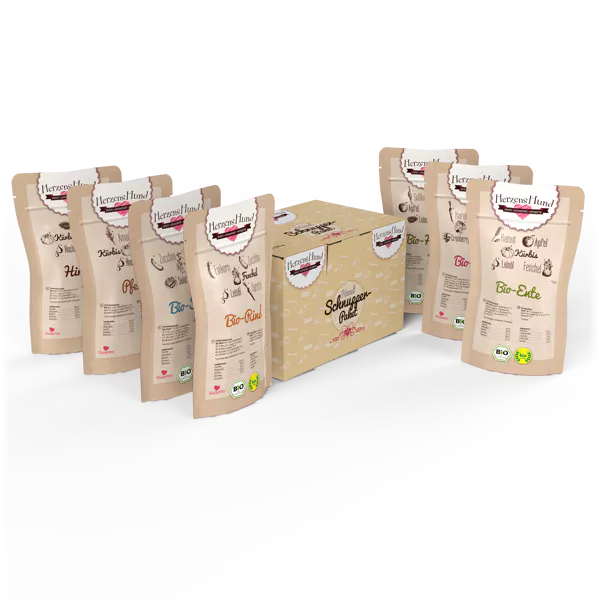 Wir empfehlen für Ihren Herzenshund eine tägliche Futterration von 2-3 % seines Körpergewichtes. Das ist als Richtwert zu verstehen und sollte auf jedes Tier individuell abgestimmt werden, je nach Rasse, Jahreszeit, Alter, Aktivität und Stoffwechsel. Ihr Hund sollte immer genügend Wasser zur Verfügung haben.