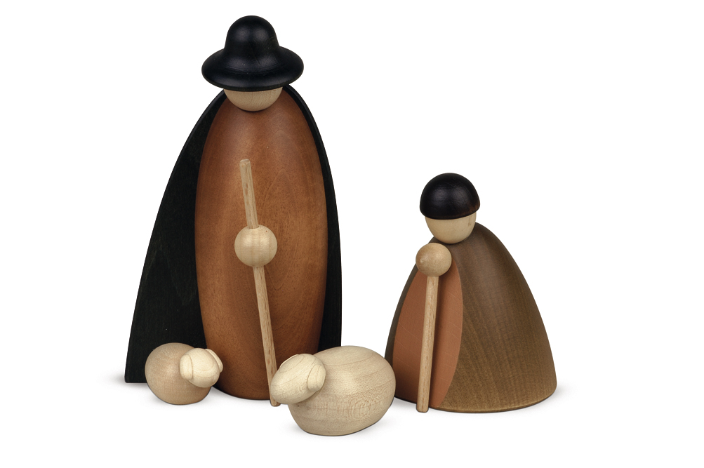Mit ihrer organischen Formsprache und der natürlichen Holzlasur tragen die gedrechselten Holzfiguren die für die Manufaktur typische Handschrift.