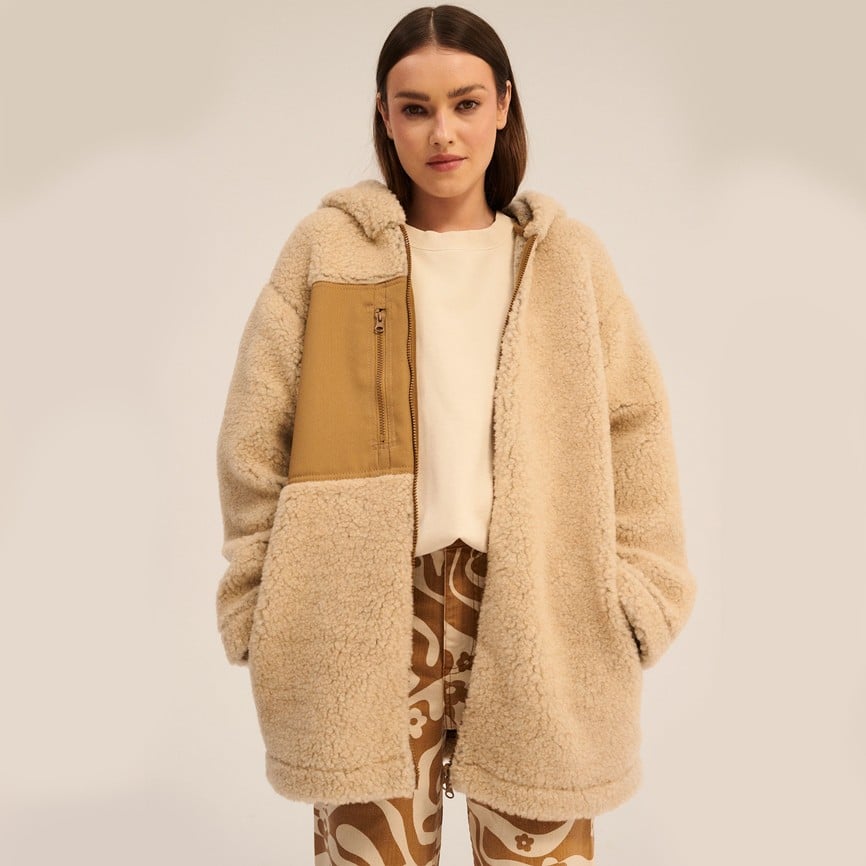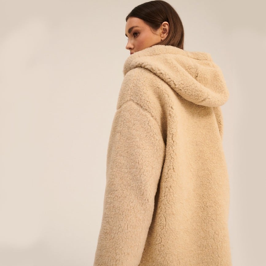 ULTRALEICHTE WOLLE 100 % Wolle in einem Fleece mit Schaffellstruktur und einer sehr leichten Formel. Der Stoff zeichnet sich durch außergewöhnliche Weichheit und Elastizität aus, wodurch er uns sanft umhüllt. Charakteristisch für dieses Material ist seine schwarze Basis, die die Farbe des verwendeten Wollvlieses intensiv zur Geltung bringt.