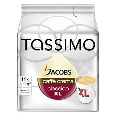 Mit der praktischen XL-Becherportion hält der Kaffeegenuss des Tassimo Jacobs Caffè Crema classico XL noch länger an. Erleben Sie den vollmundigen Geschmack des Jacobs Verwöhnaromas und die samtige, goldene Crema. Ihr Lieblingsgetränk – vollautomatisch mit nur einem Knopfdruck zubereitet. Tassimo, Caffè Crema, XXL, aus dem Hause Jacobs erhalten Sie in einem 133 g Beutel mit 16 T DISCs Kapseln.