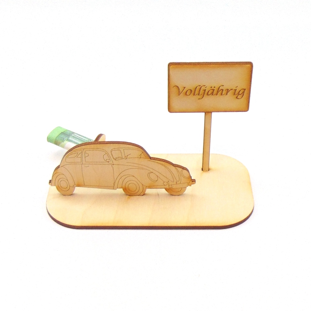 Das Auto mit Ortschild, mit dem Schriftzug “Volljährig”, besteht aus 3 Teilen, die zusammen gesteckt und geklebt werden können.