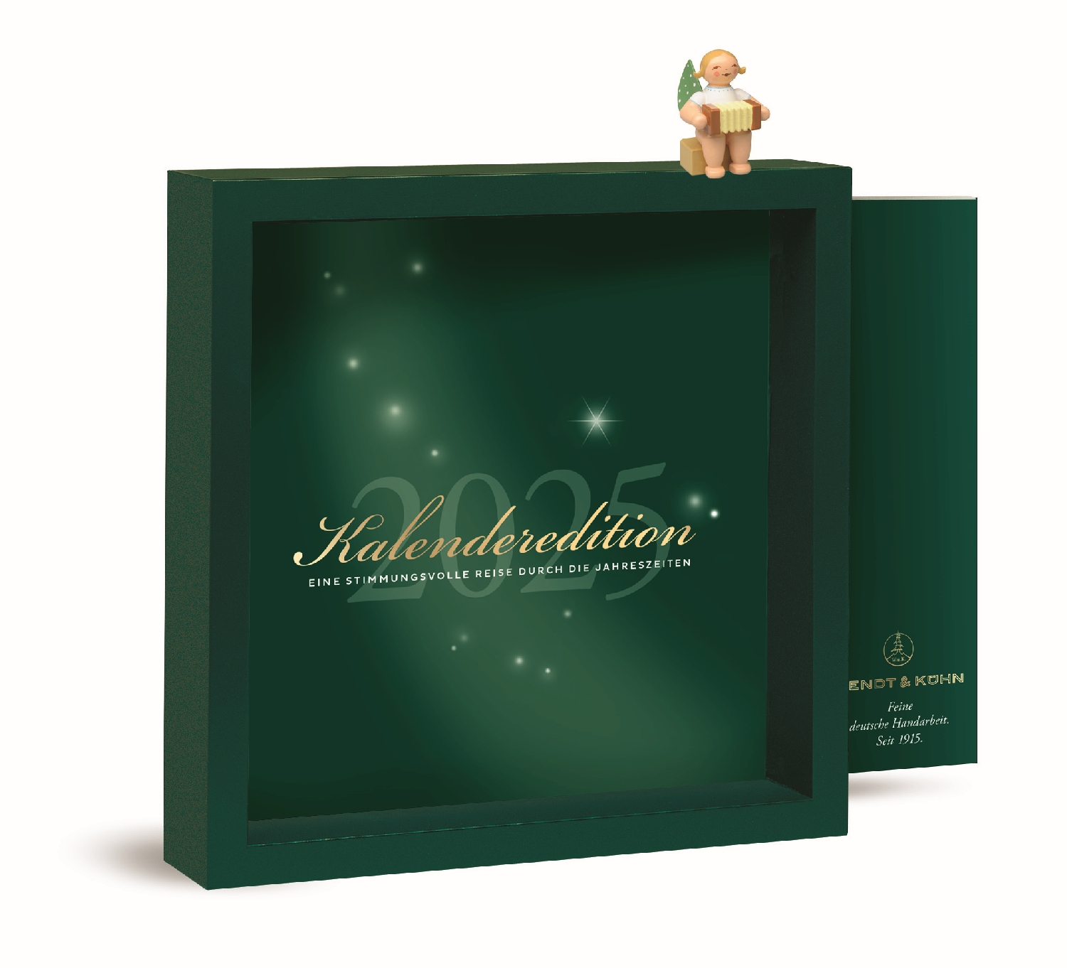 Ein wundervolles neues Jahr, ein wundervoller neuer Kalender von Wendt & Kühn. Dieses komplette Kalender-Set ist passend für all jene, die bisher noch keinen Kalenderrahmen von Wendt und Kühn besitzen. Er besteht aus einem hölzernen, grün lackierten Rahmen, 12 Kalenderblätter mit reizenden Fotografien aus dem Figuren-Sortiment des Herstellers sowie einer Kalenderfigur. Der Kalenderrahmen – wenn einmal gekauft oder geschenkt bekommen – kann jedes Jahr wiederverwendet werden. Die zwölf Kalenderblätter werden vom Hersteller jedes Jahr neu gestaltet und können seitlich in den Rahmen geschoben werden. Die Kalenderfigur erscheint ebenfalls in jedem Jahr neu. Die aktuelle Figur für das Jahr 2025 ist ein sitzender Engel mit Harmonika. Kalenderfiguren und 12-teilige Kalenderblätter erhalten Sie wie gewohnt bei uns im Erzgebirgshaus Ulbricht in Chemnitz und Seiffen sowie hier in unserem Onlineshop www.erzgebirgshaus.com.