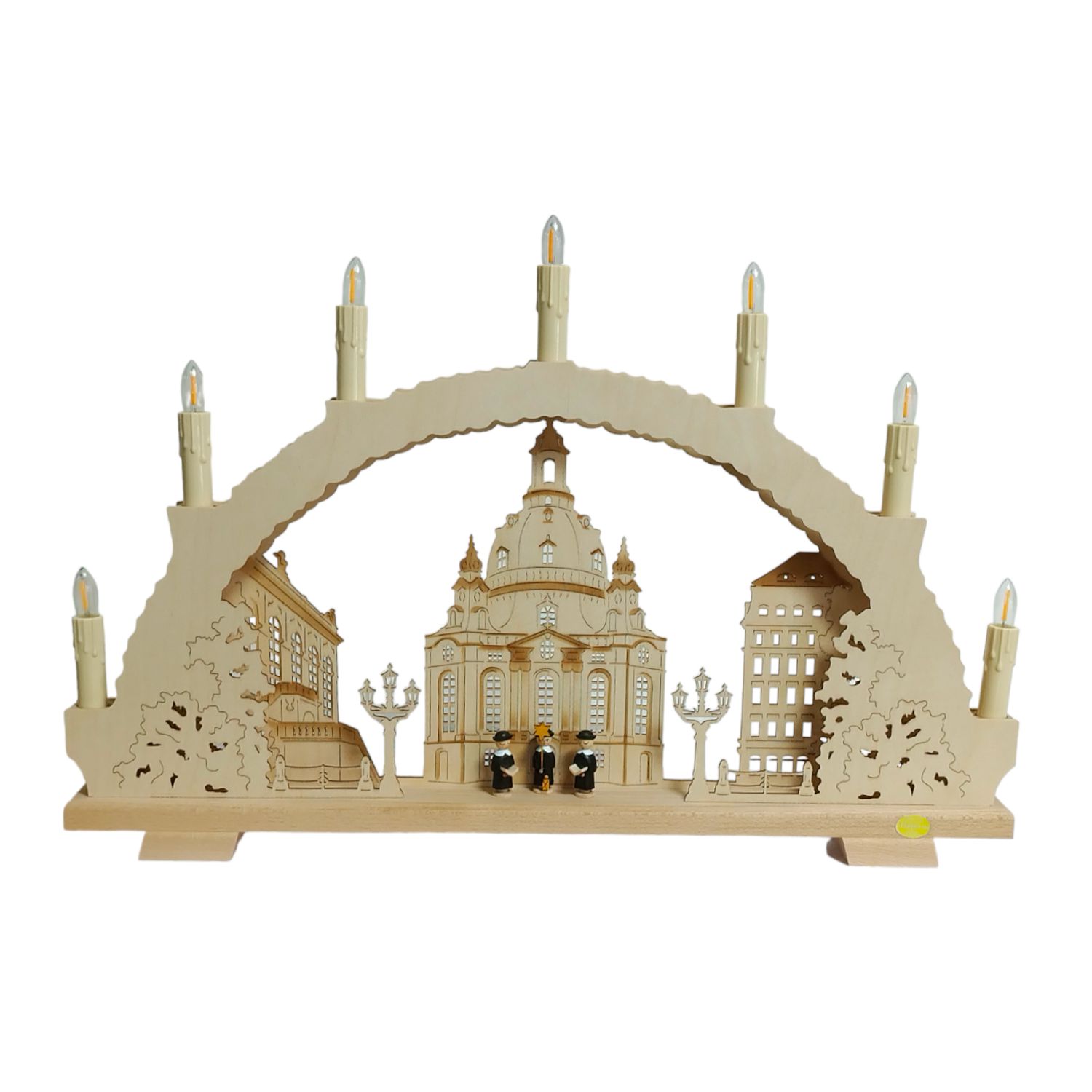 Dieser klassische LED Schwibbogen Dresdener Frauenkirche aus 3 mm Birkenholzsperrholz gefertigt, strahlt mit einer direkten 7-flammigen LED-Beleuchtung. Im Mittelpunkt des Bogens erhebt sich die weltberühmte Dresdner Frauenkirche. Vor ihr hat sich ein 3-köpfiger Kurrendenchor versammelt. Die drei Kurrendensänger sind in schwarze Roben gekleidet und halten klassisch Gesangsbücher, Sternstäbe und Laternen. Links und rechts neben der Frauenkirche sind die wunderschönen Altstadthäuser Dresdens abgebildet. Dieses wunderschöne Motiv bringt Licht in die dunkle Jahreszeit und verleiht mit seiner detailreichen Darstellung eine nostalgische und stimmungsvolle Atmosphäre.