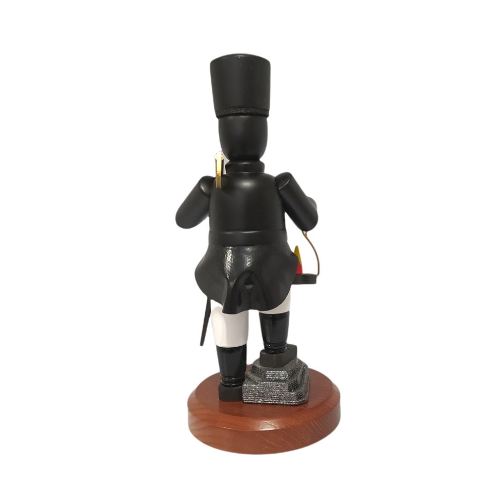 Die schwarz-rote Jacke des Bergmann wird aufwendig von goldenen Akzenten geschmückt. Mit schwarzen Schuhen steht er fest auf seinem Podest wobei ein Fuss auf einem großen glitzernden Brocken Erz ruht. Sein freundliches Gesicht mit den großen blauen Augen, der roten Knollennase sowie rosa Wangen wird von einem schwarzen Schnauzbart geziert während im Mund seine Pfeife steckt. In Händen hält er ganz traditionell ein brennendes Grubenlicht, auf seiner Schulter ruht seine Hacke welche ebenfalls Gold verziert ist. Das Oberteil des Bergmanns lässt sich ganz einfach vom Unterteil lösen um die Räucherfigur mit Räucherkerzen bestücken zu können.