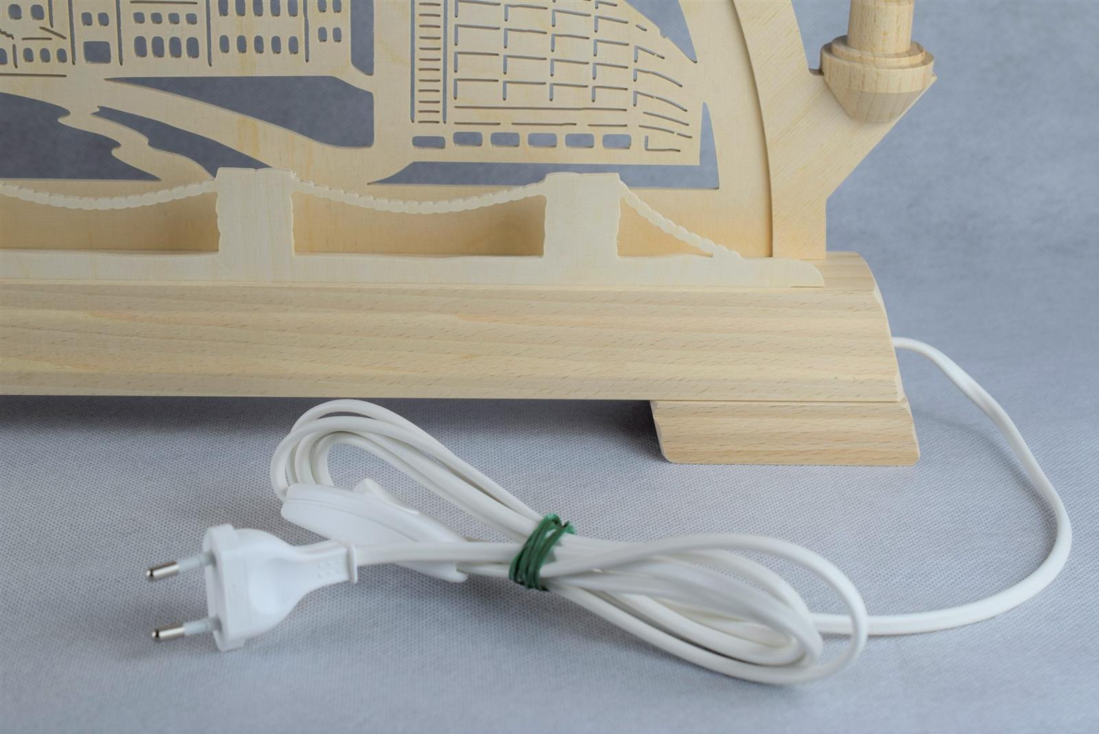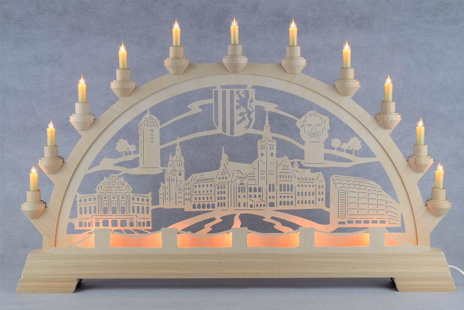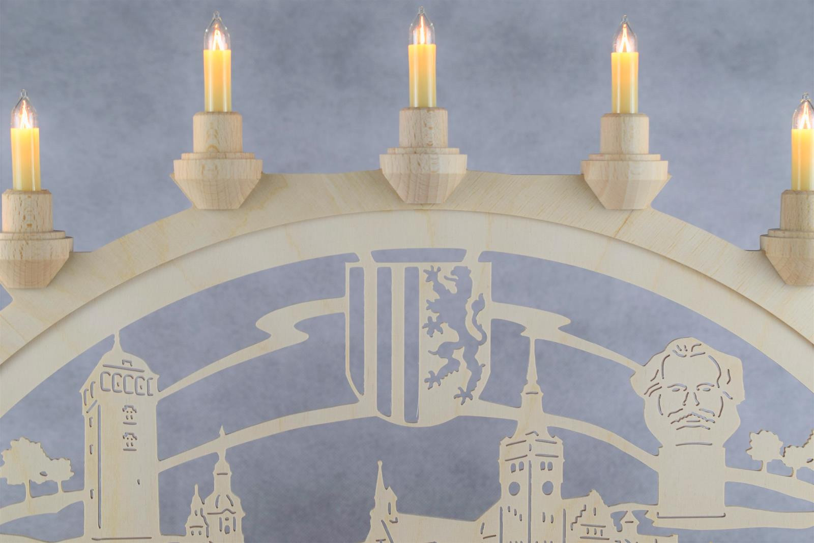 11 Kleinschaftkerzen auf dem Bogen und 5 Riffelkerzen als Vorbeleuchtung lassen die Chemnitzer Motive in hellem Glanz erstrahlen. Zu sehen sind das Stadtwappen von Chemnitz, das Chemnitzer Opernhaus, der Rote Turm, Altes und Neues Rathaus, Karl-Marx-Kopf und das Sächsische Archäologiemuseum Chemnitz SMAC im ehemaligen Kaufhaus Schocken der Gebrüder Salman und Simon Schocken.