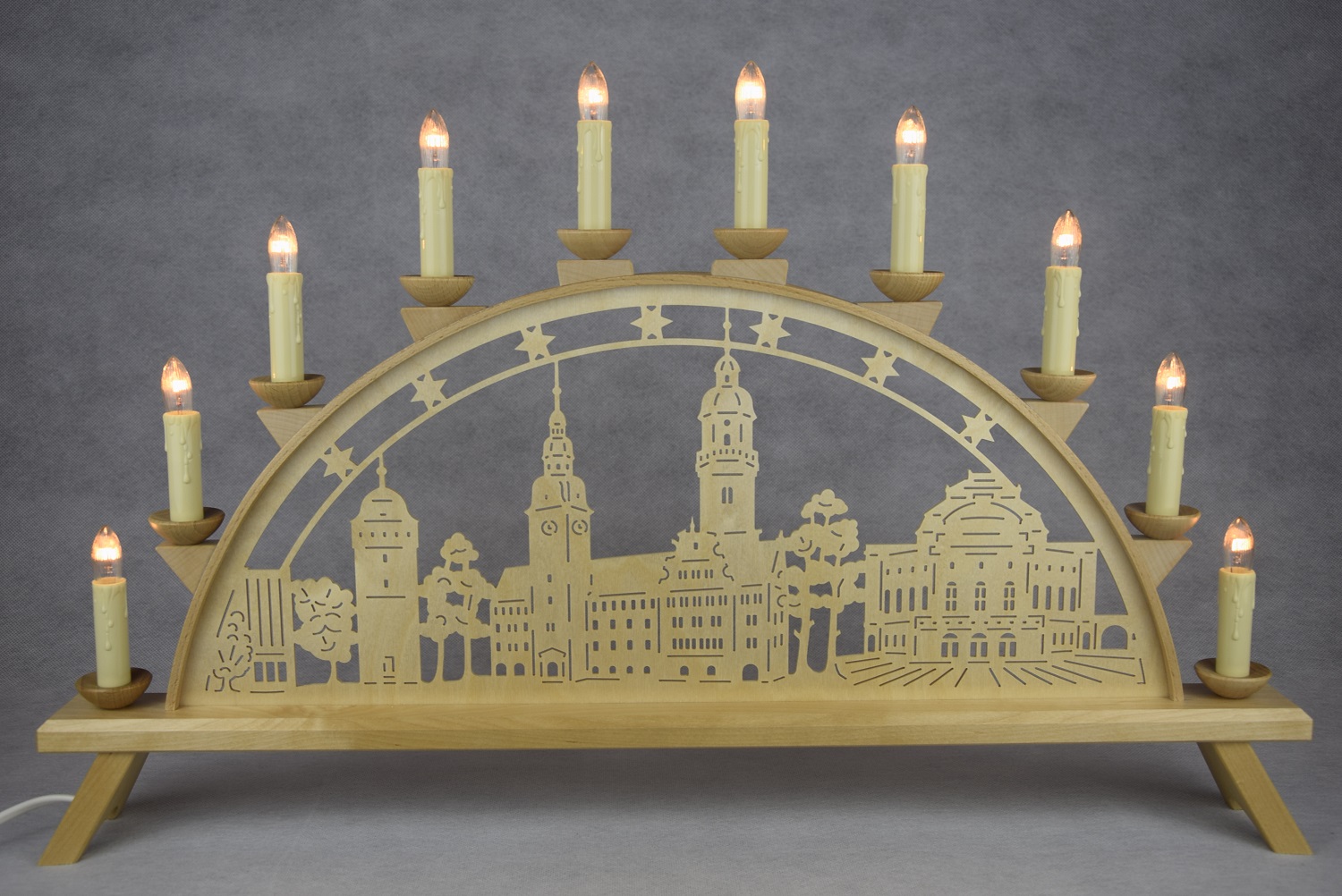 Der Schwibbogen ist mit einer elektrischen Beleuchtung ausgestattet, die mit Riffelkerzen (23V) betrieben wird. Das warme Licht der Riffelkerzen sorgt für eine stimmungsvolle Atmosphäre und hebt die filigranen Motive besonders hervor. Für eine noch energieeffizientere und langlebigere Beleuchtung besteht die Möglichkeit, die Riffelkerzen gegen LED-Riffelkerzen (gegen Aufpreis) auszutauschen. Diese bieten eine längere Lebensdauer und sind besonders energiesparend.