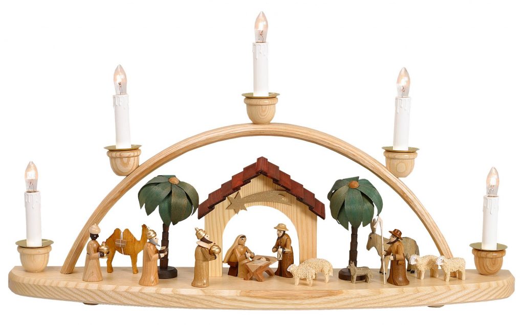 Schwibbogen mit Krippenhaus elt. 5 Kerzen farbig lasiert, Figuren natur 6cm