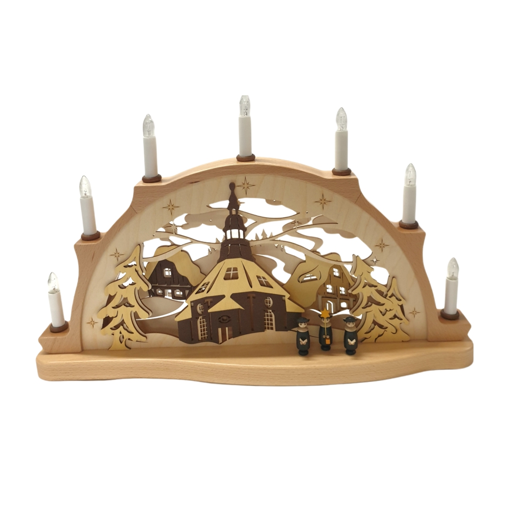 In liebevoller Handarbeit sowie einem Blick für Details stellt das Unternehmen Zeidler diesen Schwibbogen – Seiffener Kirche und Kurrende her, in schlichten natur-tönen gehalten ist er ein stiller und doch eindrucksvoller Hingucker.