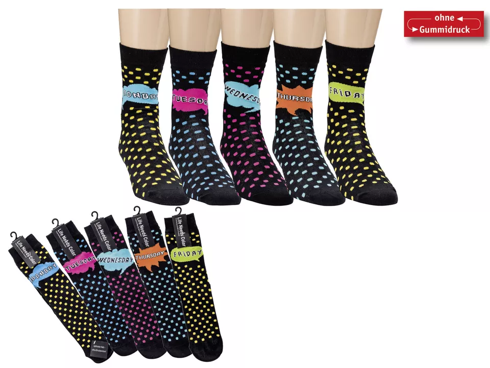 Sie erwerben Socks 4 Fun Wochentags-Socken mit Englischer Schrift, mit Komfortbund, handgekettelte Spitze, die verarbeiteten Materialien entsprechen dem ÖKÖTEX Standard 100