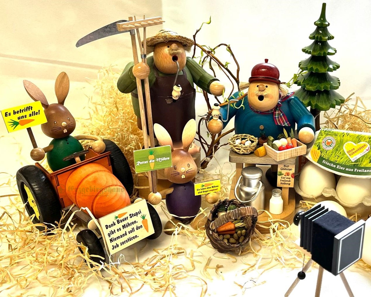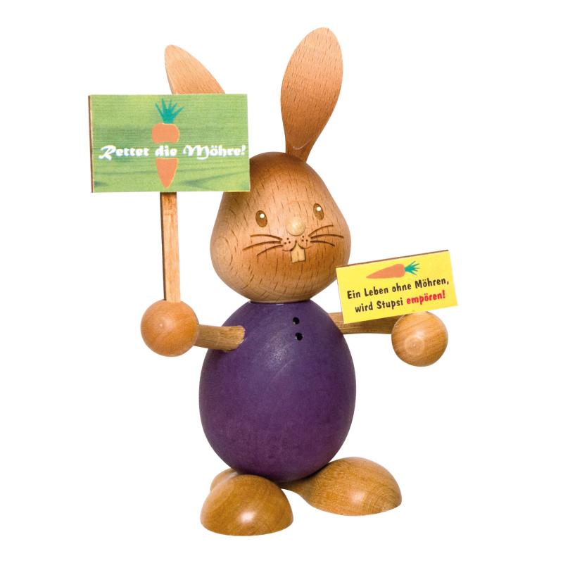 Nun demonstrieren auch noch die Osterhasen! Stupsi legt sich richtig ins Zeug für seine Lieblingsmöhren. Das Osterfest darf natürlich trotzdem wie geplant stattfinden. Die Figur ist ca. 12 cm groß, der gedrechselte Grundkörper in Form eines Ostereis ist lilafarben bemalt.