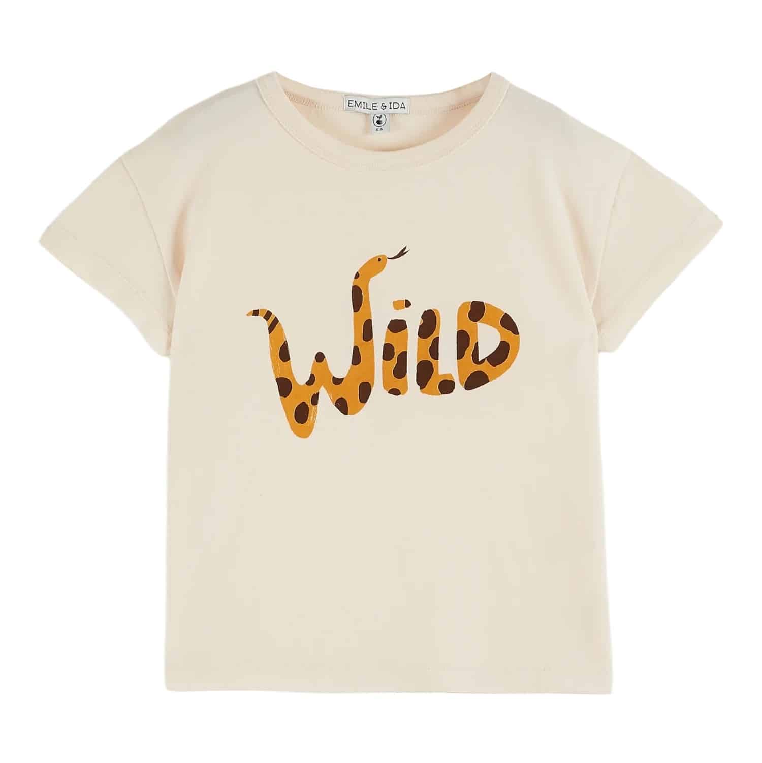 Cremefarbenes T-Shirt aus Bio-Baumwolle mit einer Schlange in Karamell und schwarzen Punkten.
