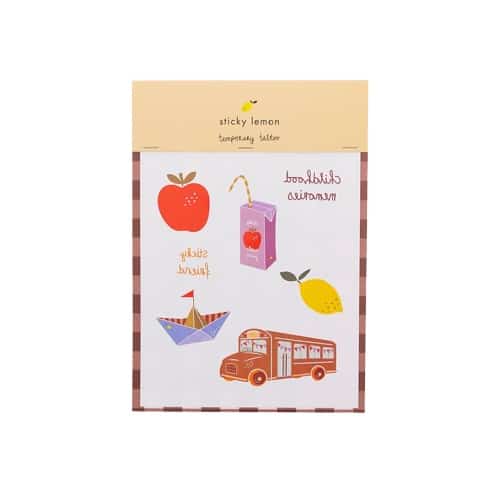 7 Tattoos: Apfel, childhood memories, Zitrone, Bus, Boot, sticky friends, Apfelsaft
