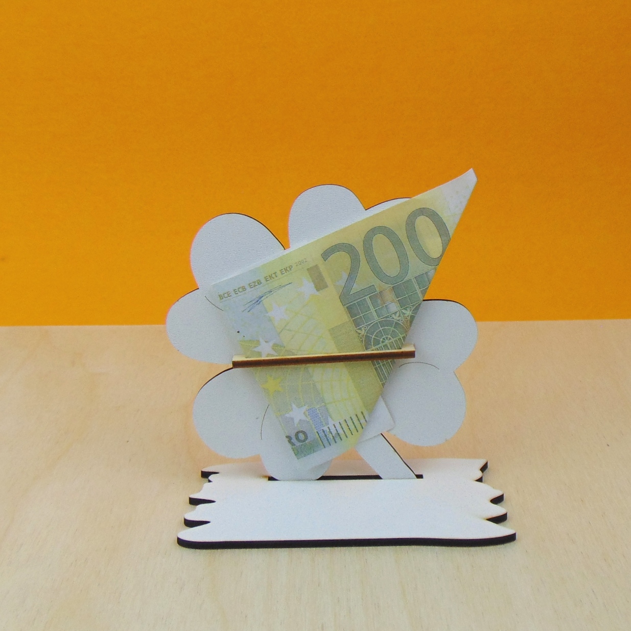 Dazu bekommen Sie einen Gutscheinhalter, den Sie beliebig nach Ihrem Geschmack am Holzteilchen befestigen können.