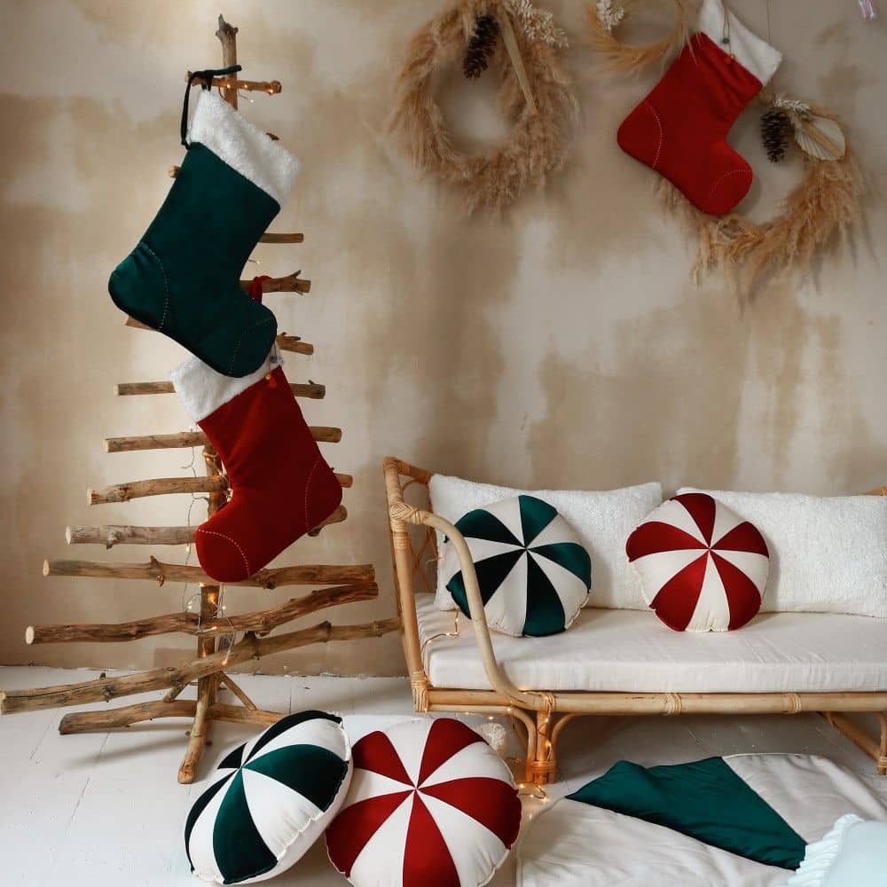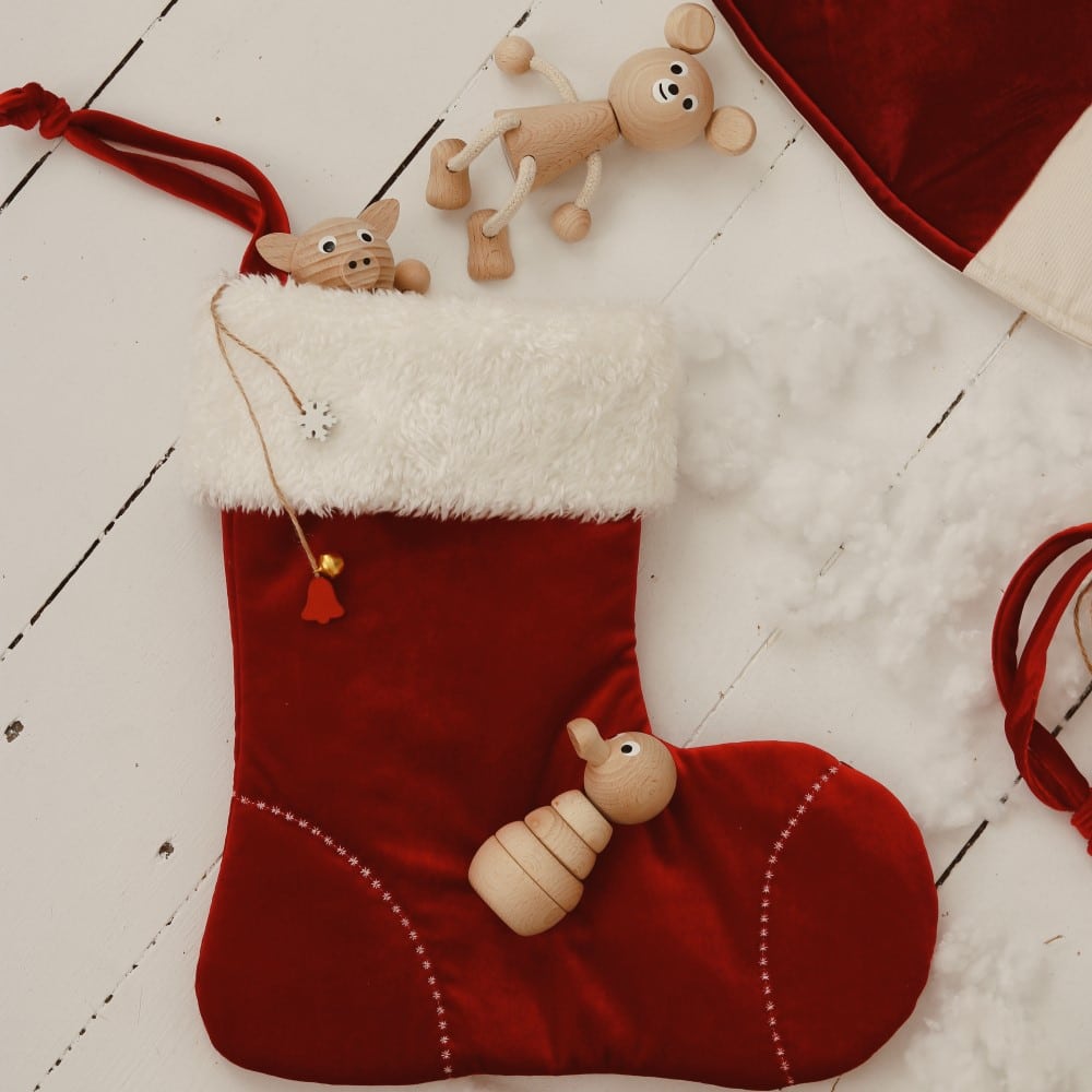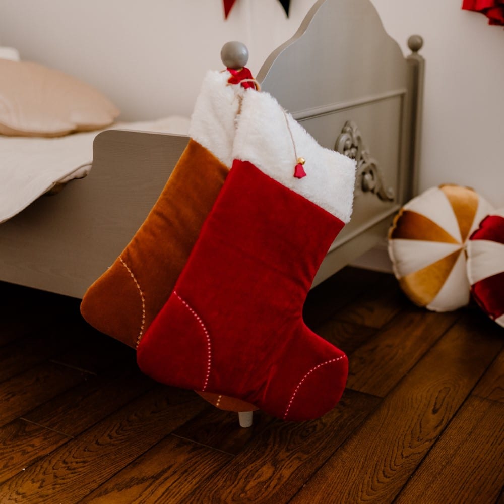 Der Weihnachtsstiefel ist aus rotem Samt und mit weißem Pelz besetzt. Darin kannst du deine Weihnachtsgeschenke verstecken! Mit dickem Baumwollstoff gefüttert, damit er auch größere Geschenke aufnehmen kann.