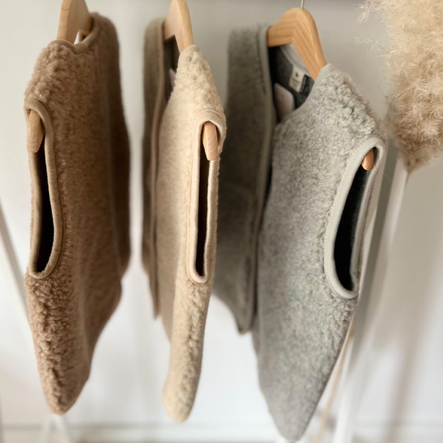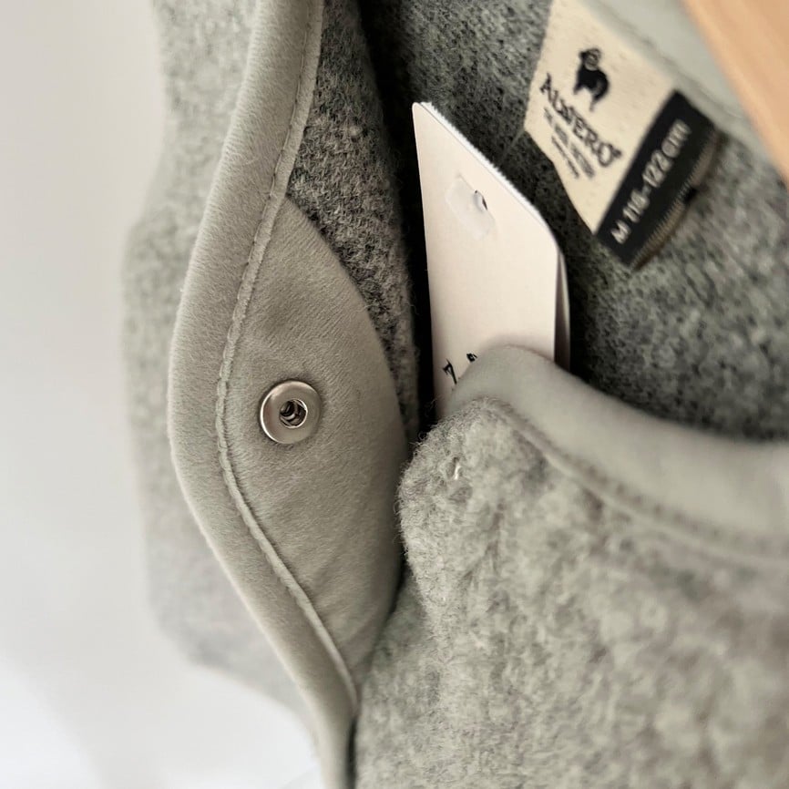 ULTRALEICHTE WOLLE 100 % Wolle in einem Fleece mit Schaffellstruktur und einer sehr leichten Formel. Der Stoff zeichnet sich durch außergewöhnliche Weichheit und Elastizität aus, wodurch er uns sanft umhüllt. Charakteristisch für dieses Material ist seine schwarze Basis, die die Farbe des verwendeten Wollvlieses intensiv zur Geltung bringt.