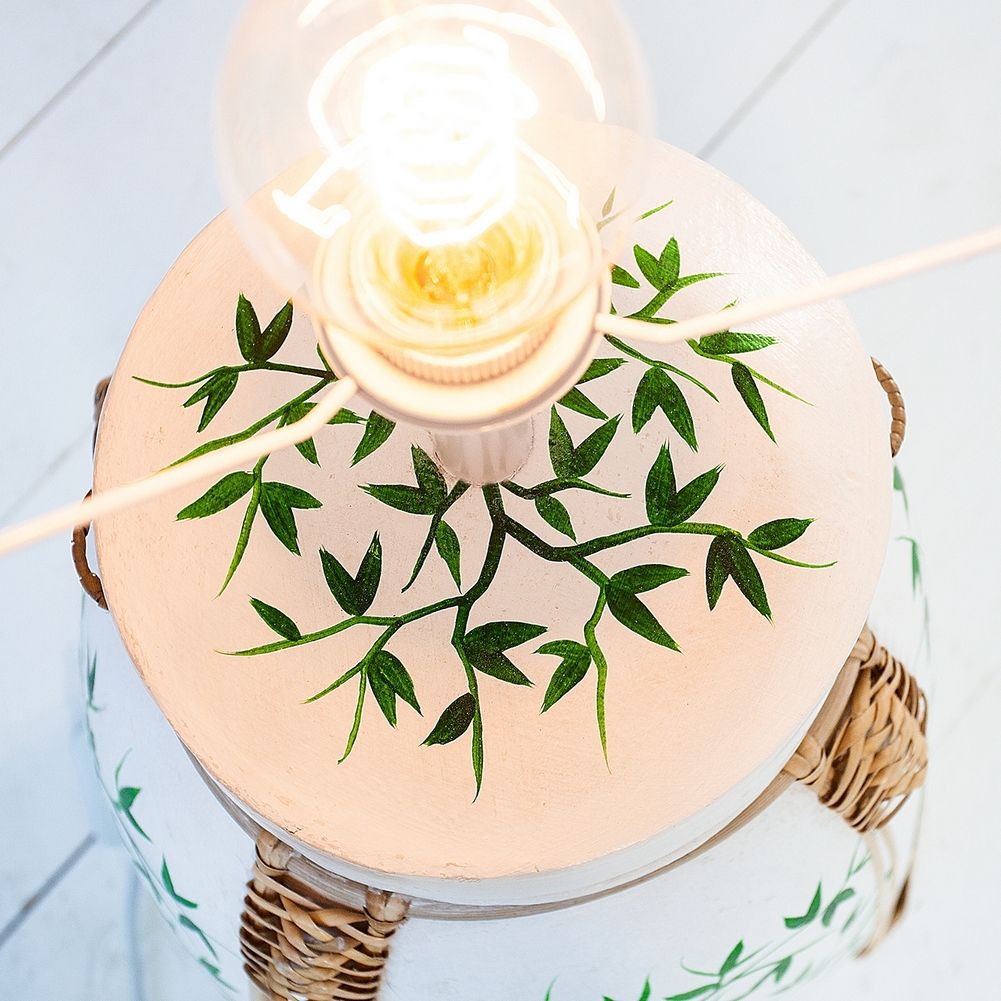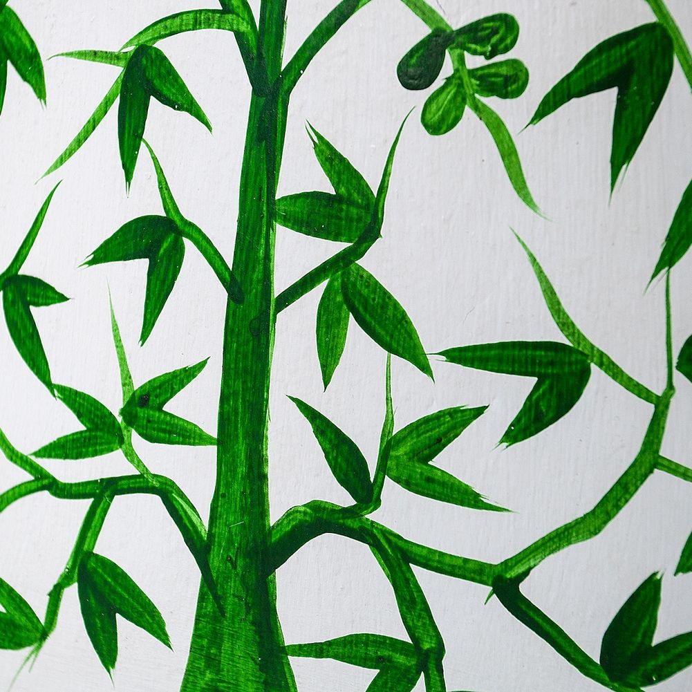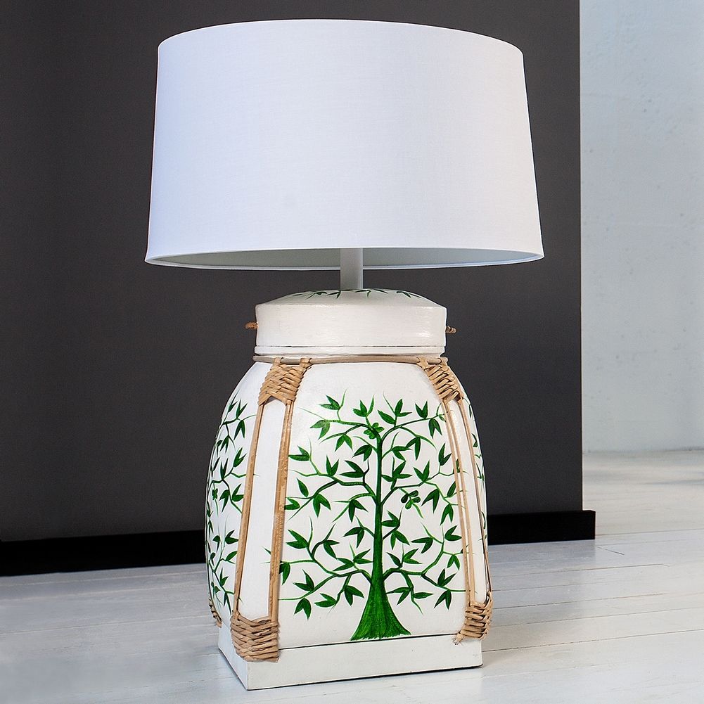 Die handgearbeitete XL Tischlampe MING ist ein Meisterwerk chinesischer Handwerkskunst. Ganz aus Bambus gearbeitet und per Hand mit grünen Baummotiven bemalt, verzaubert sie jeden Betrachter.