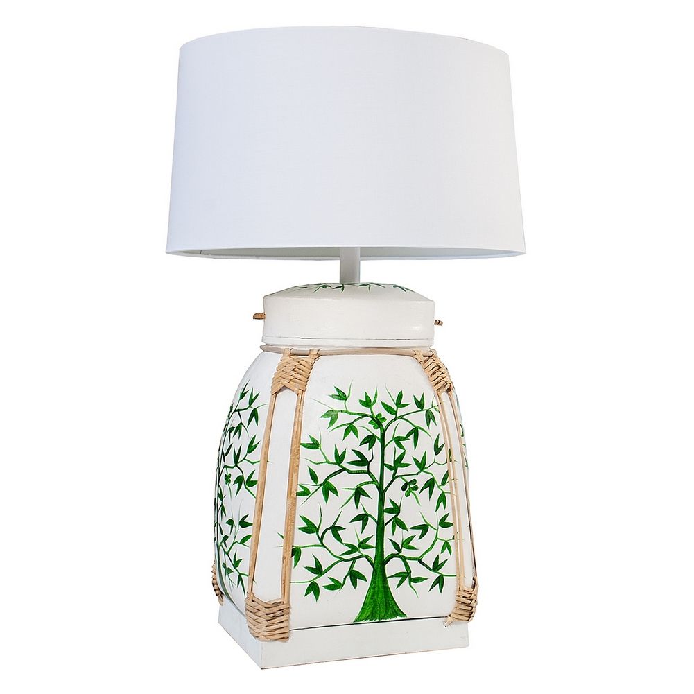 XL Tischlampe MING Weiß mit handbemaltem Baummotiv aus Bambusholz 75cm Höhe