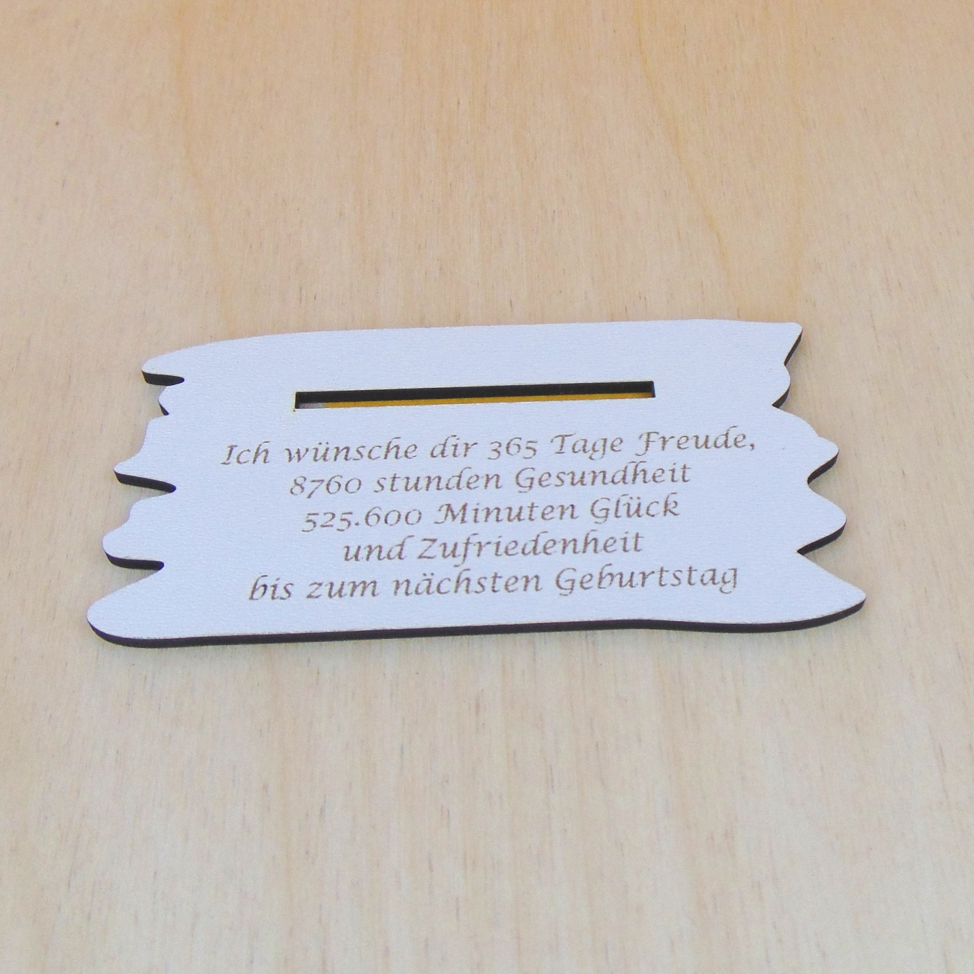 Das Glückssymbol ist mit Wünschen beschriftet und die Unterplatte hat folgenden Text: